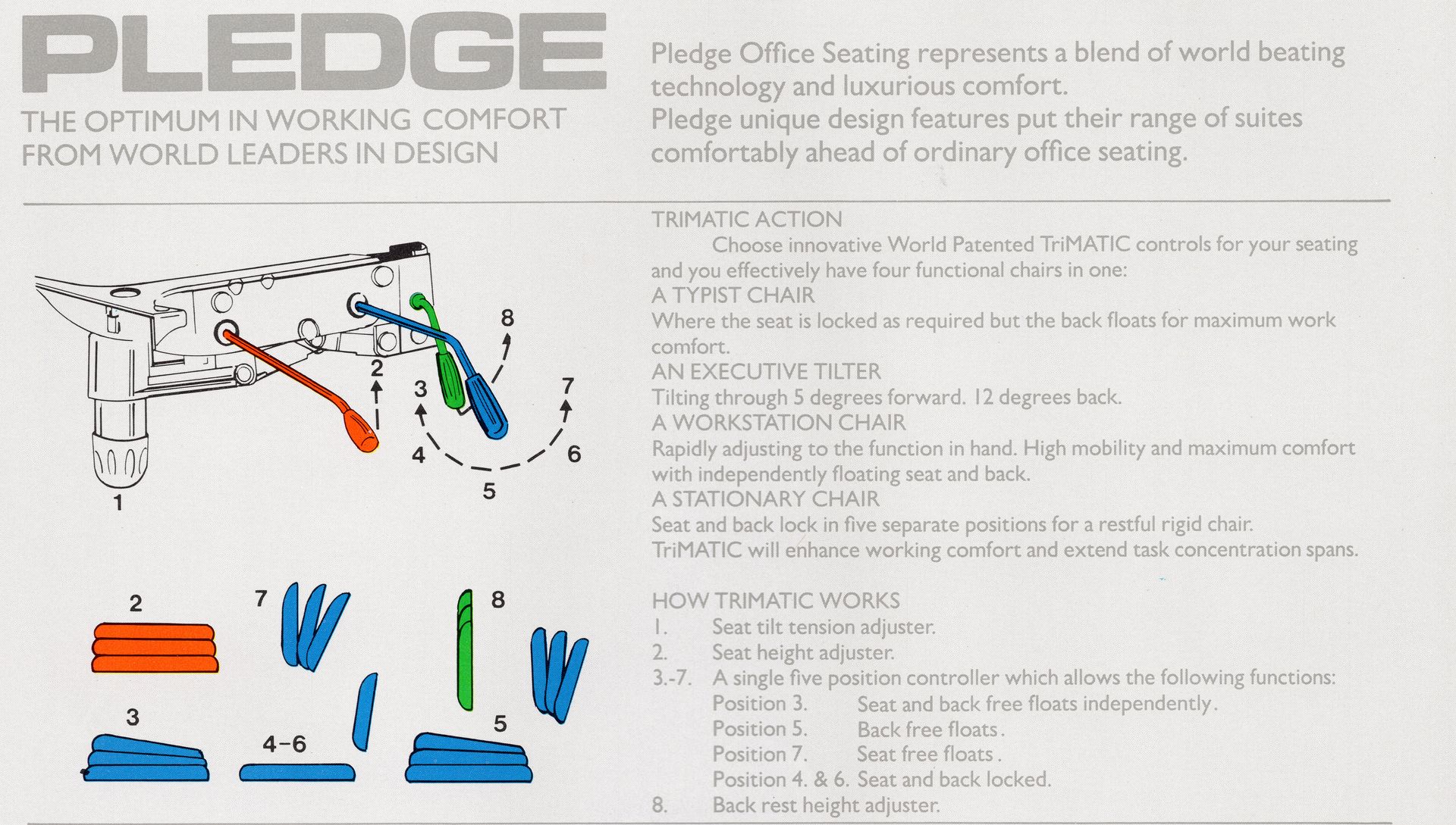 In 1980, Pledge partnered with German company Grammer to produce a range of chairs designed by American designer Charles “Chuck” Pelly. These seating systems were developed to meet modern ergonomic principles, helping users remain comfortable, healthy, and productive across a wide range of applications and environments.